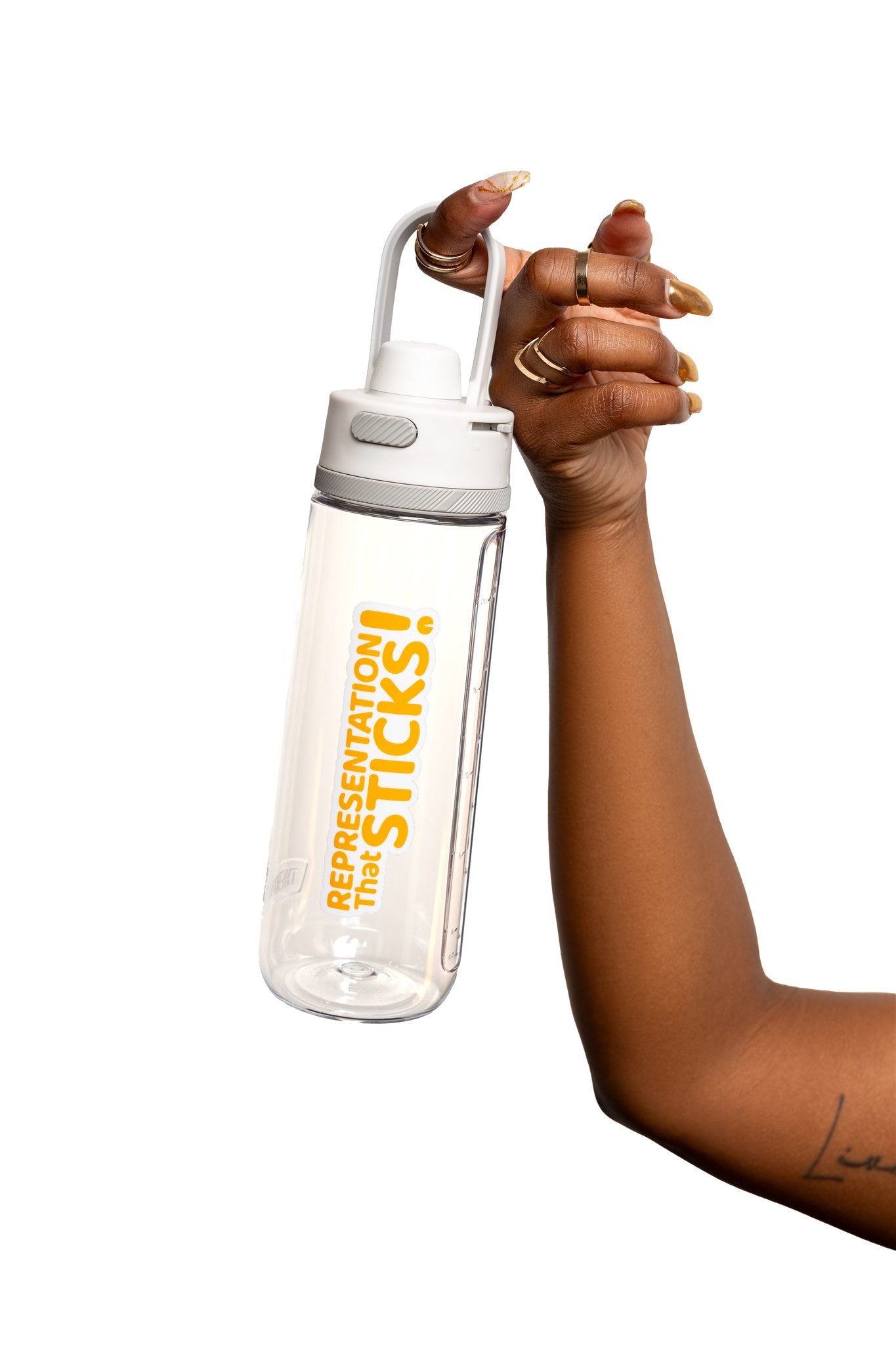 3"x4" die cut sticker: Representation That Sticks in RepME Orange and font outlined in white.